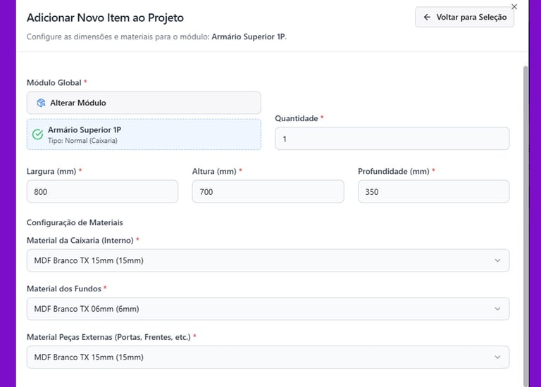 Utilizando algoritmos próprios, o sistema identifica com precisão quais módulos ou componentes devem ser orçados, gera a listagem completa das peças, separa cada uma por padrão de material e realiza a otimização em chapas reais de MDF. Em segundos, você descobre exatamente quantas chapas são necessárias para executar seu projeto — com precisão cirúrgica.